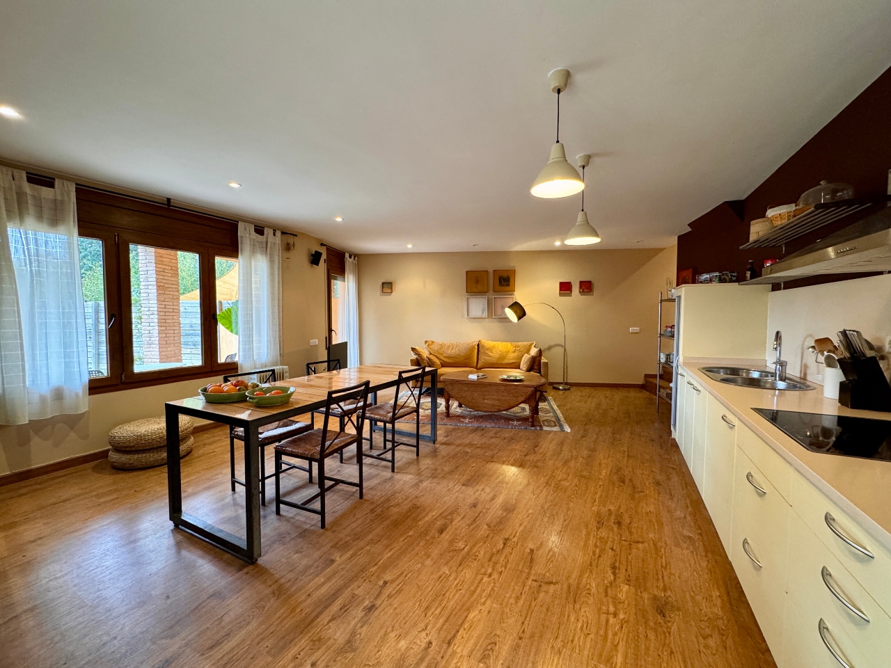 VIVIENDA 3: Sala de estar, comedor y cocina, todo en un mismo espacio, con salida al jardín y porche. Suite con vestidor. Zona de lavadero y trastero en el exterior.