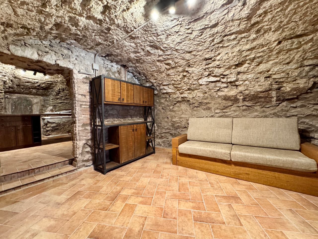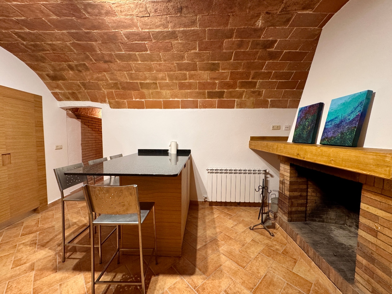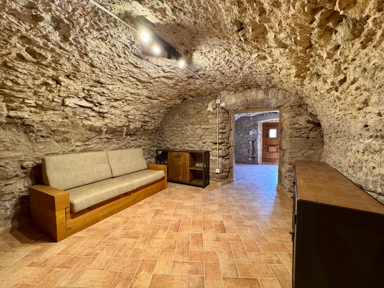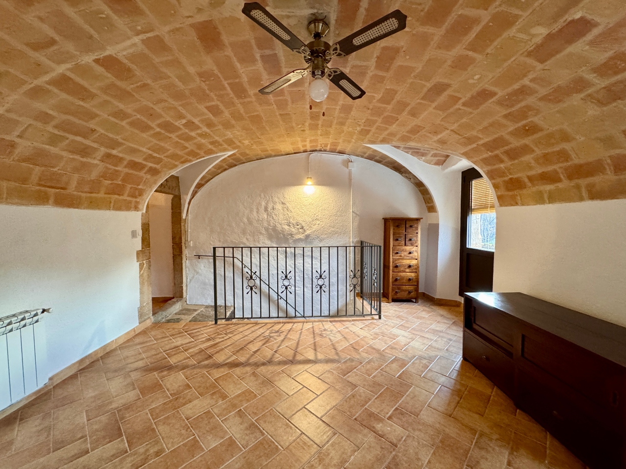 Planta Primera: sala d’estar, sala cinema, cuina office amb llar de foc totalment equipada, sala distribuïdora amb sortida al carrer de darrera, bany complet amb dutxa i sala de màquines.