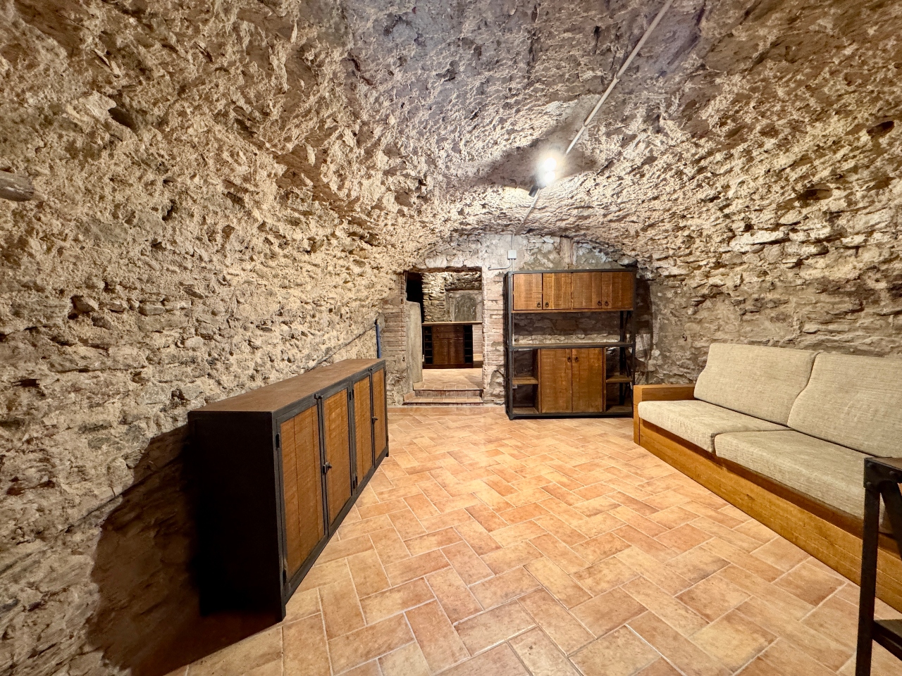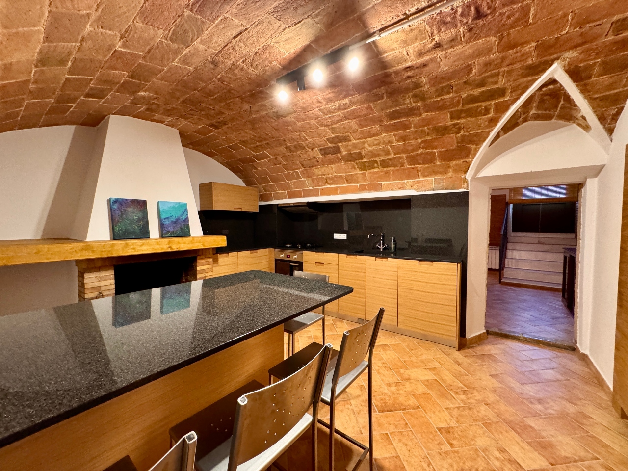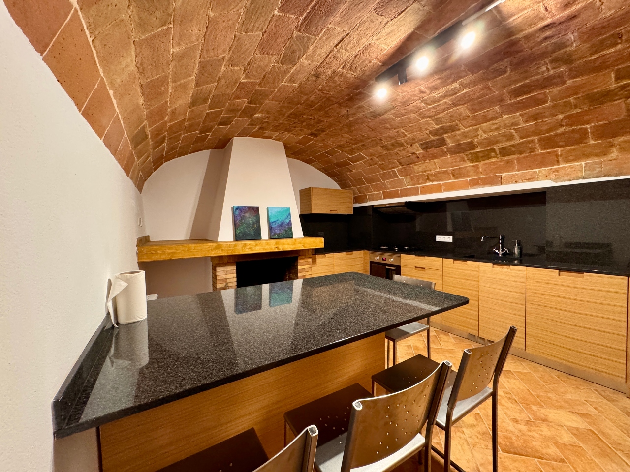 Planta Primera: sala d’estar, sala cinema, cuina office amb llar de foc totalment equipada, sala distribuïdora amb sortida al carrer de darrera, bany complet amb dutxa i sala de màquines.